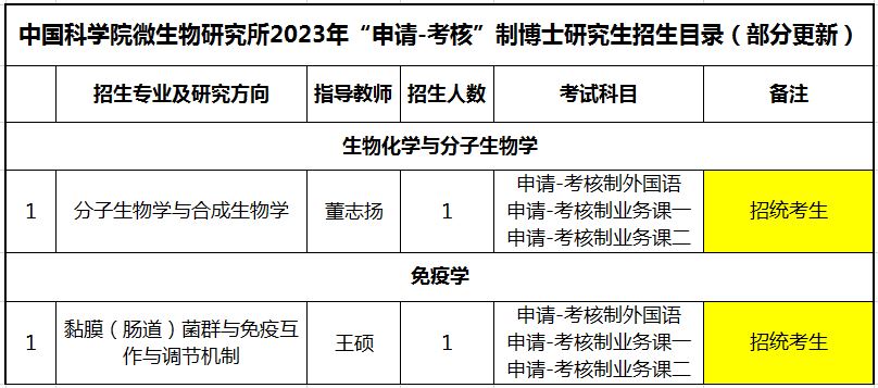 微生物所2023年“申请-考核”制招收博士研究生招生目录(部分更新)