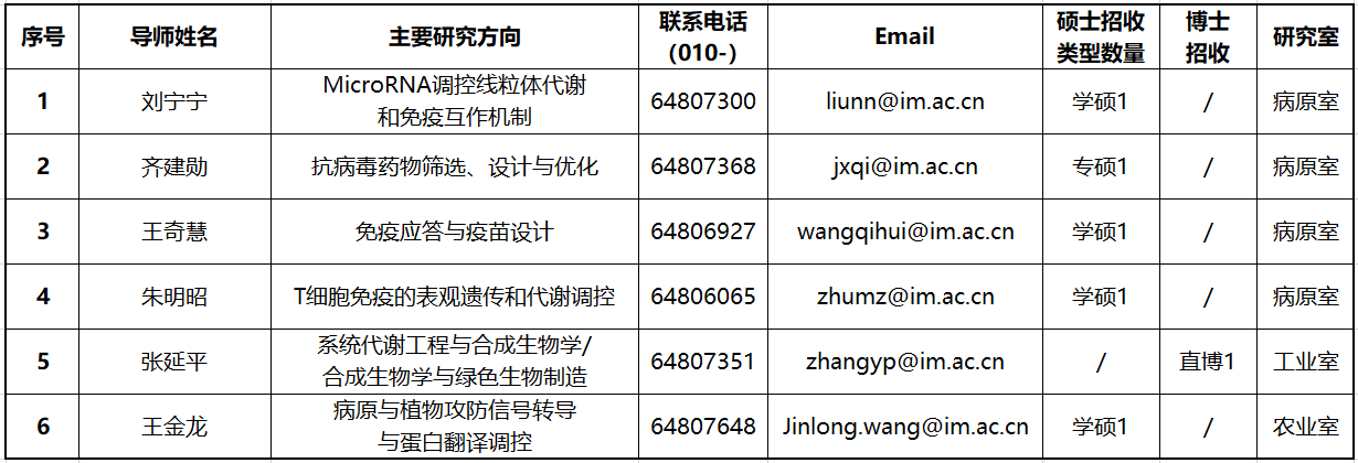 目前新增接收2026年推免生报名的导师信息如下,请已经取得所在高校推免指标且有意申请的学生阅读研究所8月4日发布的《中国科学院微生物研究所接收2026年推荐免试研究生及直博生报名通知》:https://www.im.cas.cn/yjs2018/zsxx/ssyjszs/202508/t20250804_7900771.html,将相关材料同时发送到导师邮箱和研究生部邮箱enroll@im.ac.cn,并完成扫码报名。因报名时间较为紧张,建议与导师本人电话联系。