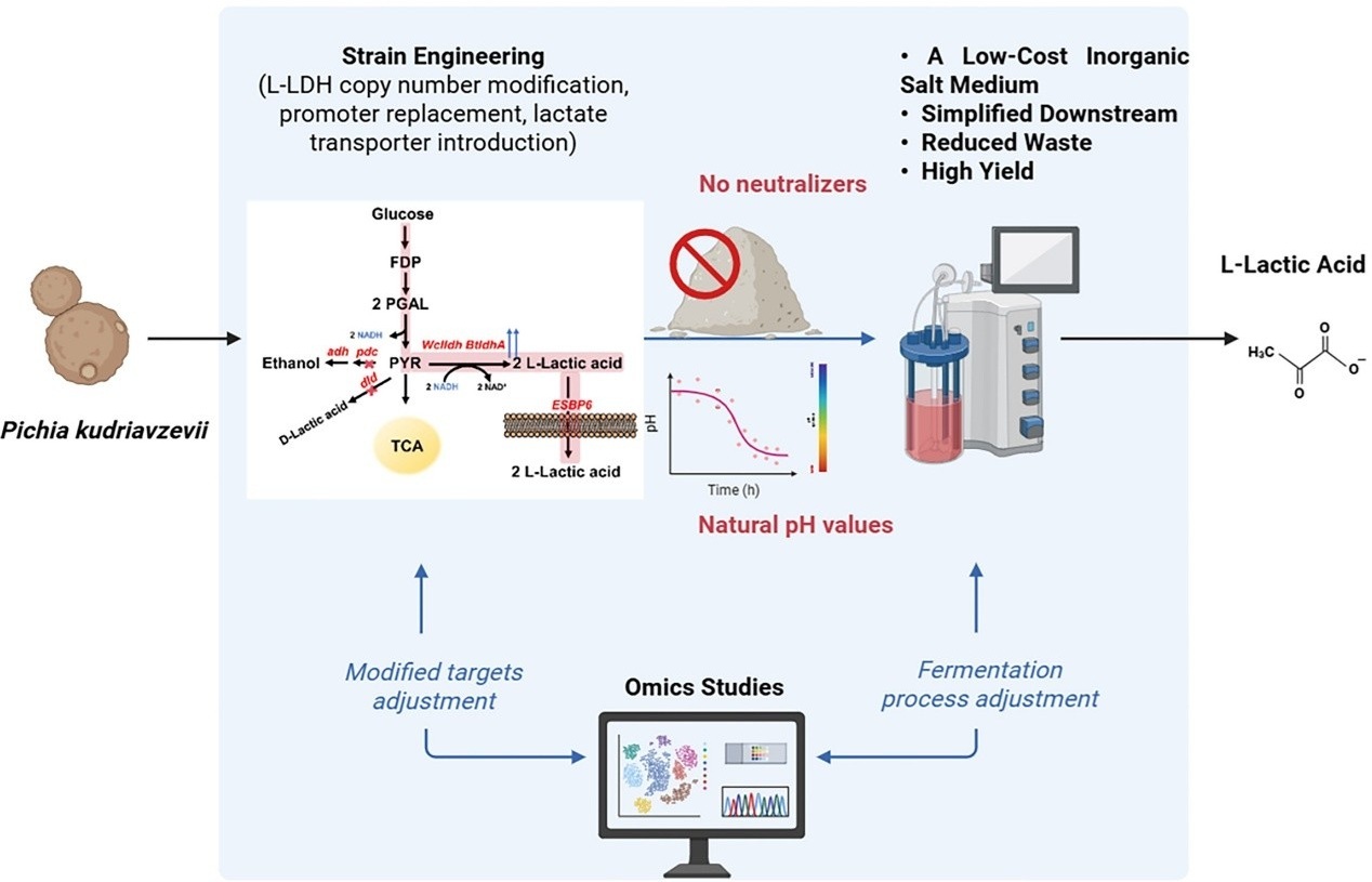 传统有机酸发酵工艺需添加中和剂来维持接近中性pH的生产环境,这导致后续纯化提取过程中会产生大量石膏废渣。为实现有机酸的清洁生产,中国科学院微生物研究所于波团队与白逢彦团队合作,从白酒酿造资源中筛选获得了具有高鲁棒性的库德里阿兹威氏毕赤酵母(Pichia kudriavzevii),该菌株可在初始葡萄糖浓度> 200 g/L、pH< 3.0的培养环境下快速生长,成为有机酸发酵的理想底盘细胞。团队通过代谢工程改造,率先报道了无需中和剂的L-乳酸发酵工艺(Journal of Agricultural and Food Chemistry, 2023),并系统阐述了非常规酵母在有机酸生物制造中的潜力与前景(Trends in Biotechnology, 2025)。