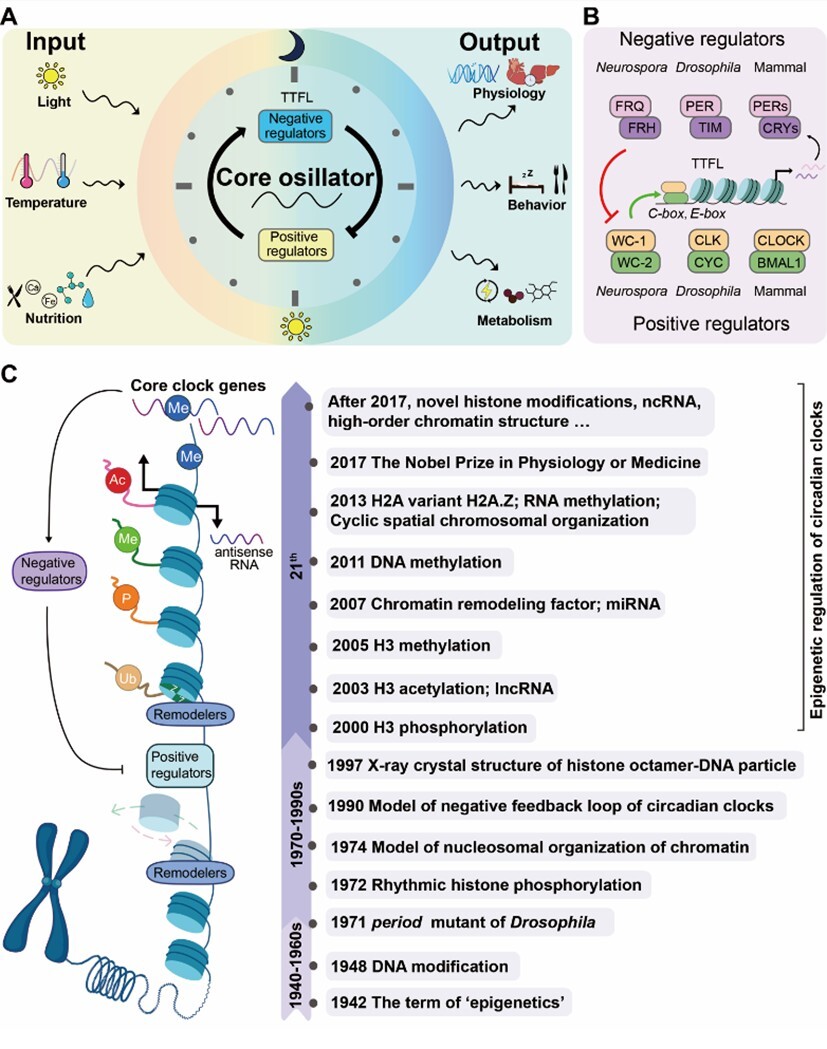 生物钟是生命体的内在计时系统,通过调节各种分子与生理活动节律,帮助生命体适应地球的昼夜环境变化。生物钟基因的节律性转录不仅依赖经典的转录-翻译负反馈回路,还受到表观遗传的精密调控。文章梳理了粗糙脉孢菌、果蝇和哺乳动物生物钟运行的保守机制,总结了组蛋白修饰、染色质重塑、DNA/RNA甲基化、非编码RNA和染色质高级结构等对生物钟的表观遗传调控作用,并探讨了该领域亟待解决的关键科学问题,包括表观遗传因子调控生物钟基因表达的生化本质、协同作用机制、信号响应模式和生理功能等。
