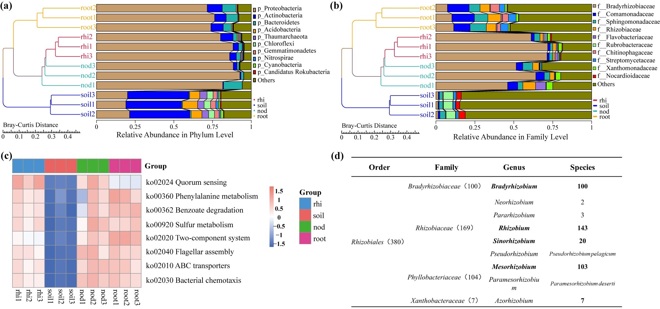 研究发现,根际与根瘤微生物群落组成高度相似,Proteobacteria为优势菌门,其中Bradyrhizobiaceae占据绝对主导地位。LEfSe分析表明,根中富集了Streptomyces、Variovorax等促生菌,这类菌株可通过调节植物激素、优化根系结构,提升大豆的抗逆性与养分吸收能力。在功能层面,根际和根瘤微生物在群体感应、鞭毛组装、细菌趋化等通路上显著富集,展现出高效的宿主定殖、信号交流和养分吸收能力。此外,宏基因组分析鉴定出380种根瘤菌,主要包括9个属:Rhizobium,Mesorhizobium,Bradyrhizobium,Sinorhizobium,Azorhizobium,Pararhizobium,Neorhizobium,Pseudorhizobium和Paramesorhizobium。此外发现最后两个属(Pseudorhizobium和Paramesorhizobium)尚无文献报道具有固氮能力。最后,通过对根瘤内生菌的分离培养,获得了黑土优势的慢生根瘤菌和其他的内生细菌,结果与根瘤宏基因组数据一致。综上所述,本研究构建了黑土大豆根际微生物组数据库,系统揭示了其微生物组特征,为东北地区大豆种植中微生物菌剂的开发利用奠定了基础。