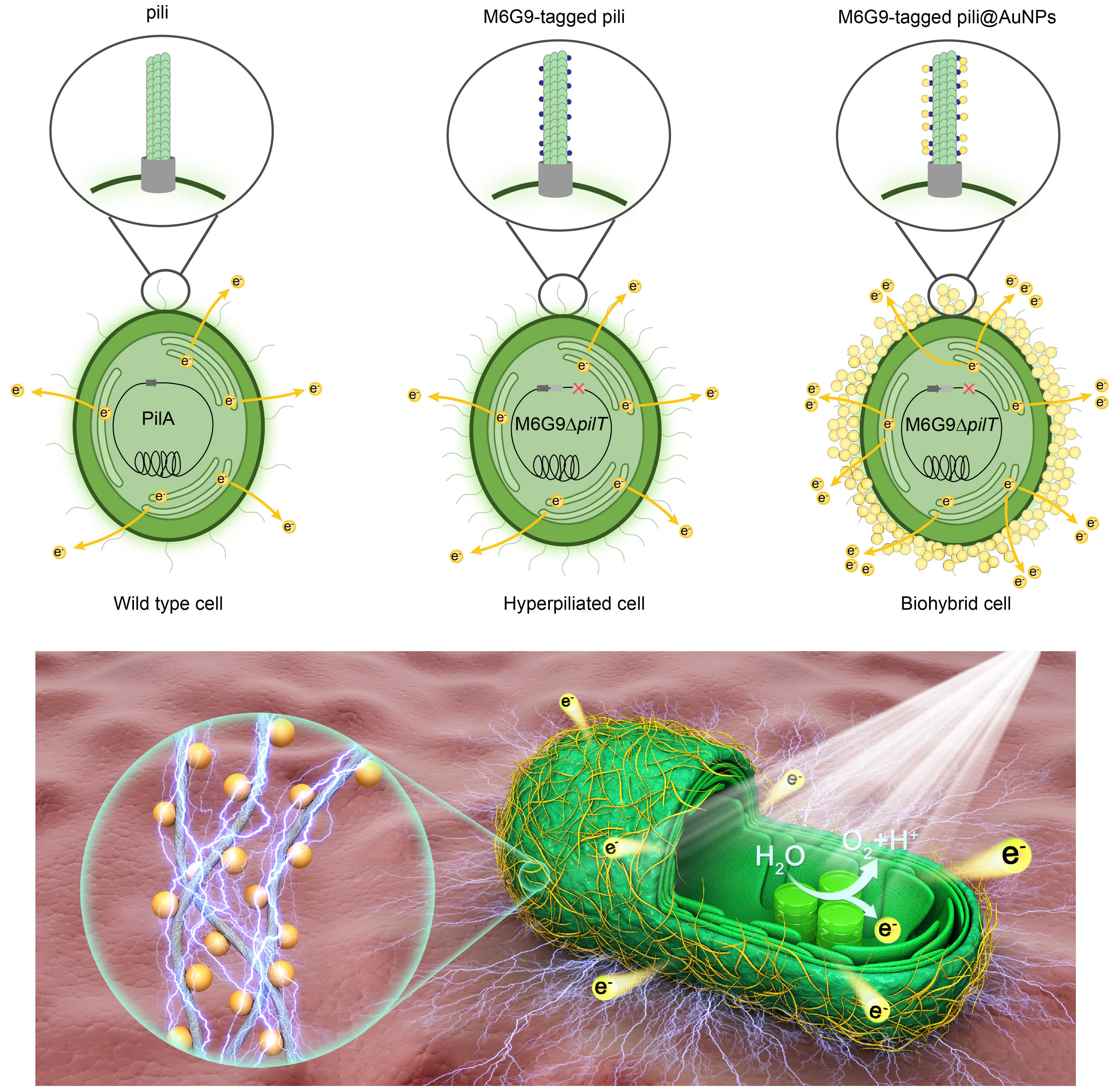研究团队选用一种能特异性吸附金纳米颗粒的短肽,将其装载到位于蓝藻表面的菌毛上。在结合肽的靶向作用下,金纳米颗粒定向富集到菌毛上,形成导电菌毛。实验结果显示,改造后的蓝藻光电流密度提升了4倍。